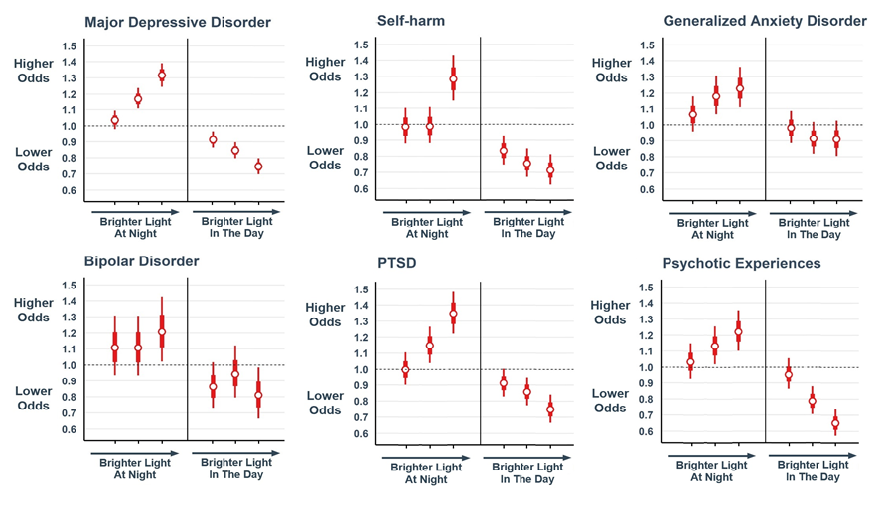 “Greater night-time light exposure was associated with increased risk for major depressive disorder, generalized anxiety disorder, PTSD, psychosis, bipolar disorder, and self-harm behaviour…