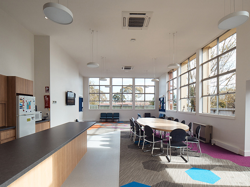Materials and colours are a perfect match for the spacious interior aesthetics of the flexibly designed dining room. Teachers can sit or stand while having discussions and socialising. The LUCCA PENDANT MelaGen® achieves outstanding colour rendering to visually highlight individuals whilst delivering low glare output, creating the ultimate solution for a relaxed and calming environment with a radiant effect.